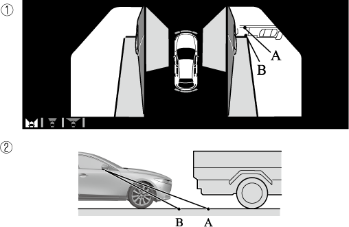 Étant donné que les lignes de guidage d’extrémité avant du véhicule ou les lignes de guidage de distance (caméra arrière) sont affichées sur la base d'une surface plane, la distance à l'objet en trois dimensions affichée sur l'écran est différente de la distance réelle.
