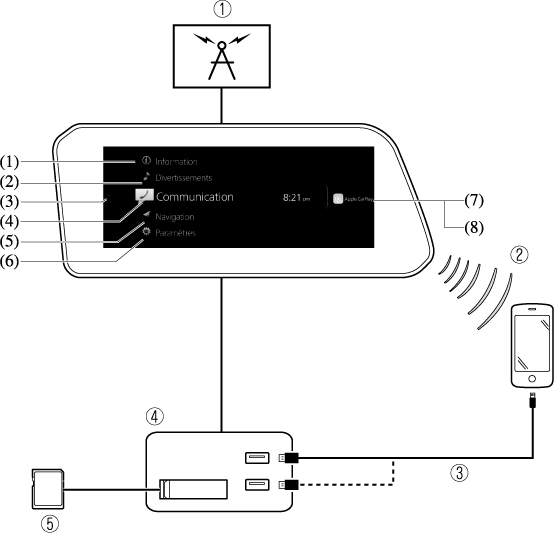 Il est possible d'utiliser Apple CarPlay™ en connectant un iPhone® compatible avec Apple CarPlay™ au port USB. |