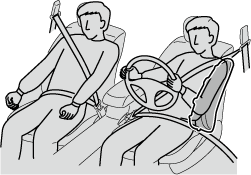 Lorsque les détecteurs de choc des coussins d'air détectent un choc latéral important, le système gonfle le coussin d'air latéral seulement du côté où le véhicule a subi le choc. Le coussin d'air latéral se gonfle rapidement pour réduire les blessures risquant d'affecter la poitrine du conducteur ou du passager avant, causées par l'impact direct sur les composants de l'habitacle tels qu'une portière ou une fenêtre.