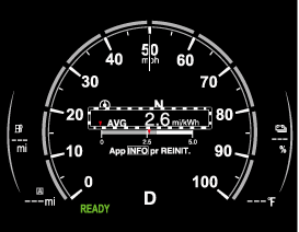 Pour réinitialiser les données d'efficacité énergétique moyenne, appuyer sur l'interrupteur INFO pendant au moins 1,5 seconde. Après avoir réinitialisé les données, - - - kWh/100 km (- - - mile/kWh) s’affiche avant que l'efficacité énergétique moyenne soit recalculée et affichée.