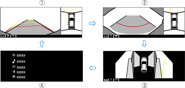 L'écran affiché peut être modifié à chaque fois que l'interrupteur du moniteur de vue à 360° est enfoncé.