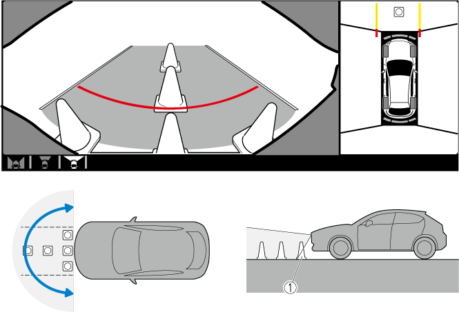 Sur l'écran de vue de dessus, les zones en noir à l'avant et à l'arrière de l'image du véhicule et les zones où les images des caméras se rejoignent sont des angles morts.