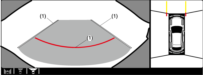 Lignes de largeur étendues du véhicule et lignes de guidage de distance (bleues et rouges) |