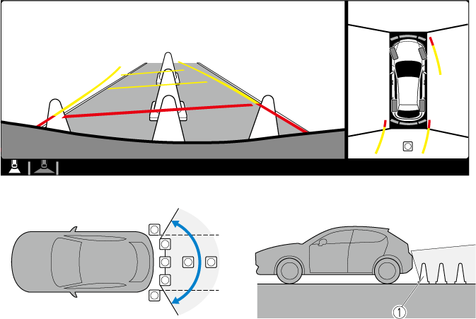 La portée de détection du capteur de stationnement est limitée. Par exemple, les obstructions se rapprochant sur le côté et les objets de faible hauteur peuvent ne pas être détectés. Toujours vérifier visuellement la sécurité du véhicule lors de la conduite.