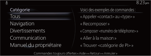 Des exemples de commandes vocales efficaces dans différentes catégories sont affichés sur l'écran supérieur de la reconnaissance vocale.