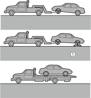 Si le frein de stationnement ne peut pas être desserré lors du remorquage du véhicule, transporter le véhicule avec les quatre roues avant et arrière soulevées du sol, comme le montre l'illustration. Remorquer le véhicule sans soulever les roues du sol peut endommager le système de freinage.