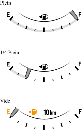 Après qu'on ait refait le plein de carburant, un certain temps pourra être nécessaire avant que l'indicateur se stabilise. En outre, il est possible que l'indicateur dévie lors de la conduite sur une pente ou dans un virage, en raison des mouvements du carburant à l'intérieur du réservoir.