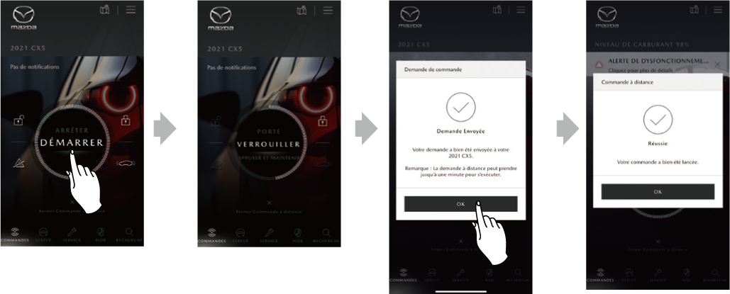 Même si la transmission d'une demande est réussie, une erreur peut se produire lors de l'exécution de l'opération du côté du véhicule en raison d'une cause telle qu'une portière laissée ouverte. Si une erreur se produit, un message contextuel s'affiche.