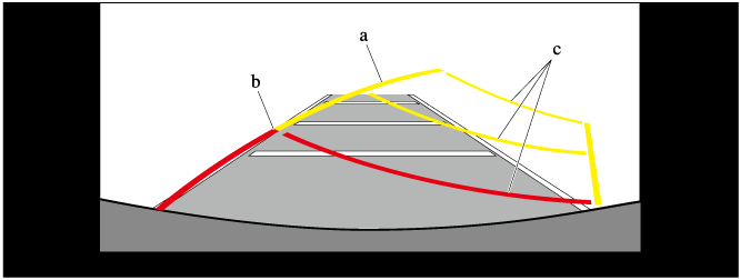 Sur l'illustration ci-dessus, le côté droit du véhicule est en position proche de la distance actuelle affichée par les lignes de guidage de distance (rouge : point à environ 0,5 m (19 po), jaune : point à environ 1,0 m (39 po), et jaune : point à environ 2,0 m (78 po) derrière le pare-chocs arrière), alors que le côté gauche est suffisamment éloigné.