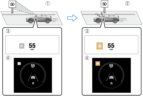 Si la vitesse du véhicule dépasse la vitesse indiquée par le panneau affiché sur l'affichage de conduite active/le tableau de bord, la zone autour du panneau de limitation de vitesse clignote en orange et l'avertissement sonore retentit au même moment. Si la vitesse du véhicule continue à dépasser cette limite, l'indication s'arrête de clignoter et reste allumée. Vérifier les conditions environnantes, puis ajuster la vitesse du véhicule à la vitesse légale en utilisant les commandes appropriées, comme en appuyant sur la pédale de frein.