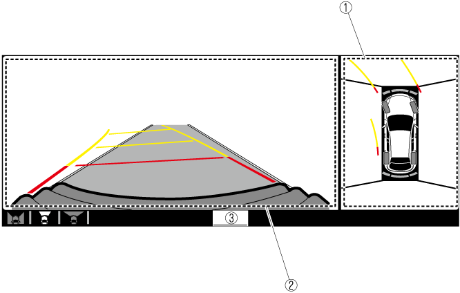 Affiche une image de la zone autour du véhicule et de l'arrière du véhicule (zone large).