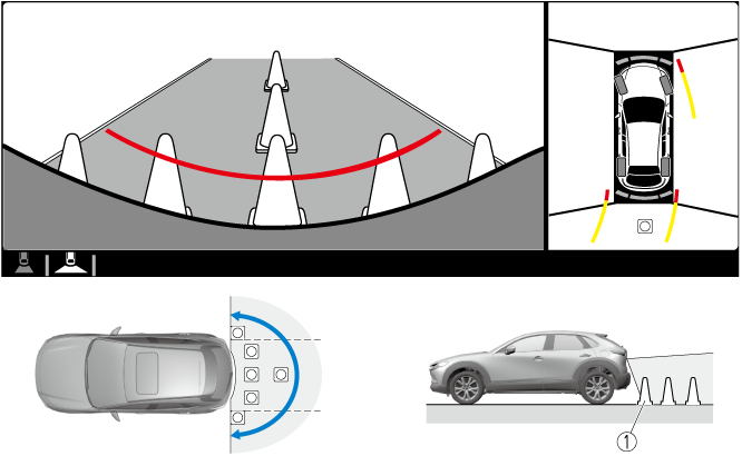 L'écran de vue de dessus/vue arrière grand angle affiche une image de l’arrière du véhicule sous un grand angle et corrige l'image pour aider à détecter les obstructions qui s'approchent par les côtés. Par conséquent, cette vue diffère de la vue réelle.