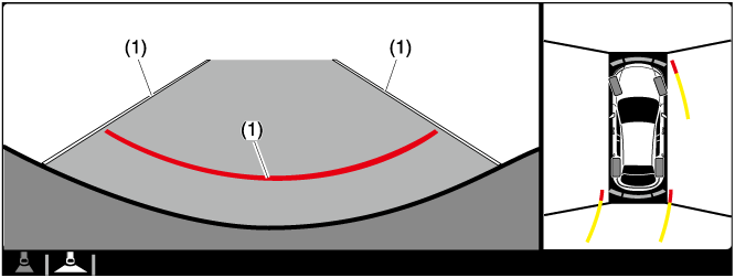 Ces lignes de guidage indiquent approximativement la largeur du véhicule et la distance jusqu'à un point mesuré à partir de l'arrière du véhicule (à partir de l'extrémité du pare-chocs).
