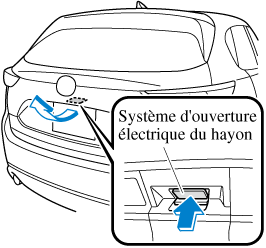 Appuyer sur l'interrupteur du hayon électrique pendant environ une seconde ou plus pendant que le hayon est en position ouverte/fermée complète. Les feux de détresse vont clignoter deux fois et le hayon s'ouvre/se ferme complètement après le bip sonore.