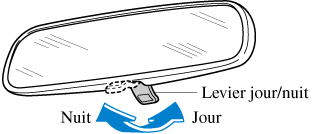 Pousser le levier jour/nuit vers l'avant pour une conduite de jour. Le tirer vers l'arrière pour réduire l'éblouissement causé par les phares des voitures roulant derrière.
