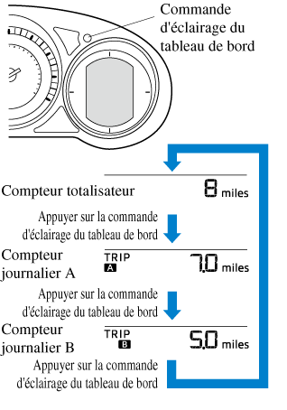 Lorsque le compteur journalier A est sélectionné, si l'on appuie sur le sélecteur de nouveau à moins d'une seconde cela changera l'affichage au compteur journalier B.
