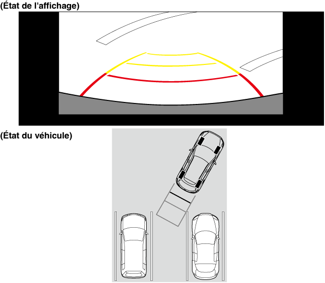Comme il peut y avoir une différence entre l'image affichée, comme indiqué ci-dessous, et les conditions réelles du stationnement, s'assurer toujours de la sécurité à l'arrière du véhicule et dans la zone environnante directement avec les yeux.