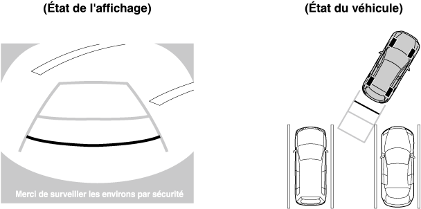 Après que le véhicule ait commencé à entrer dans l'espace de stationnement, continuer à reculer lentement de manière que les distances entre les lignes de largeur du véhicule et les côtés de l'espace de stationnement à gauche et à droite soient approximativement égales.