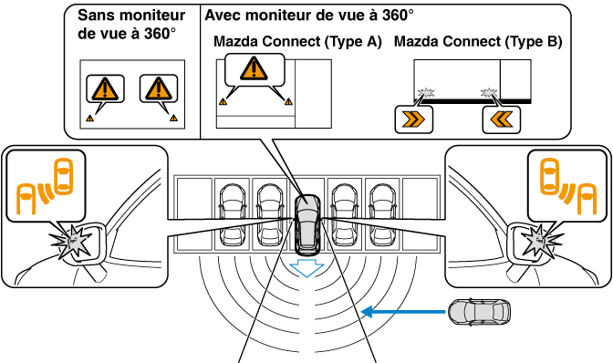 L'indication d'avertissement du système RCTA sur le moniteur de vue à 360° est aussi synchronisée avec le voyant de surveillance des angles morts (BSM) sur les rétroviseurs de portières.