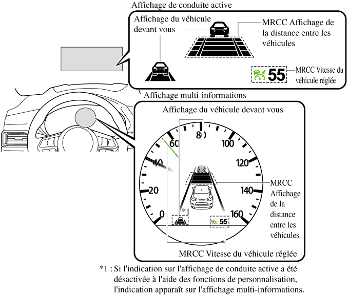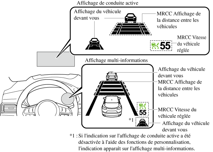 Indication d'affichage du régulateur de vitesse à radar Mazda avec fonction Stop & Go (MRCC avec fonction Stop & Go)