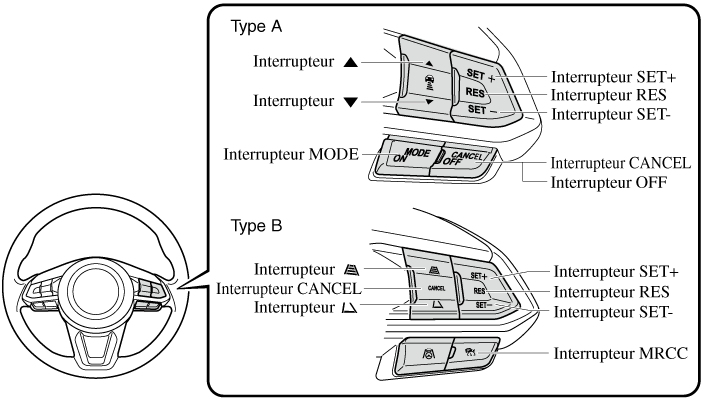 Appuyer sur l’interrupteur CANCEL 2 fois lorsque le système MRCC avec fonction Stop & Go est en marche pour désactiver le système.