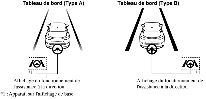 Il est possible de consulter l'affichage multi-informations pour vérifier si l'assistance à la direction effectue des contrôles en liaison avec les lignes de voie de circulation ou un véhicule devant.