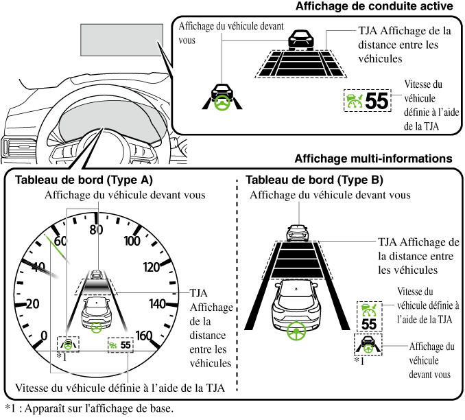 L'état de réglage et les conditions de fonctionnement du système TJA sont indiqués sur l'affichage multi-informations et l'affichage de conduite active.