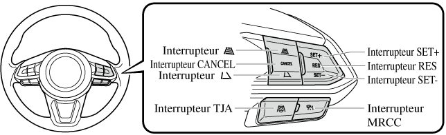 Lorsque l'interrupteur TJA est enfoncé alors que le système de régulation de la vitesse à radar Mazda avec fonction Stop & Go (MRCC avec fonction Stop & Go) est en marche, la TJA fonctionne. De plus, lorsque l'interrupteur MRCC est enfoncé alors que la TJA est en marche, le système de régulation de la vitesse à radar Mazda avec fonction Stop & Go (MRCC avec fonction Stop & Go) fonctionne.