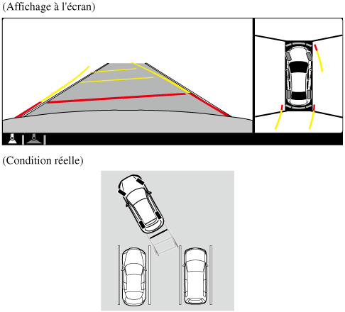 Comme il peut y avoir une différence entre l'image affichée à l’écran, comme indiqué ci-dessous, et les conditions réelles du stationnement, toujours vérifier la sécurité à l'arrière du véhicule et dans la zone environnante directement avec les yeux.