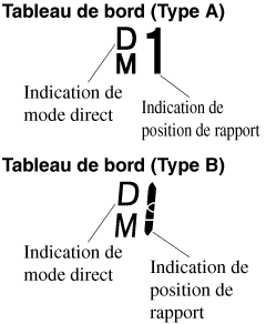 Tandis qu'en mode direct, les indications D et M s'allument et la position de la vitesse utilisée est indiquée.