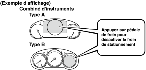 Appuyer sur la pédale de frein. Annuler la fonction AUTOHOLD ou le régulateur de vitesse à radar Mazda avec fonction Stop & Go (MRCC avec fonction Stop & Go), et faire contrôler le véhicule par un concessionnaire agréé Mazda. |