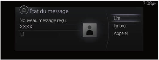 Lorsque le paramètre Notifications de messages texte est activé et que votre appareil Bluetooth® reçoit un message, la notification du message s'affiche.