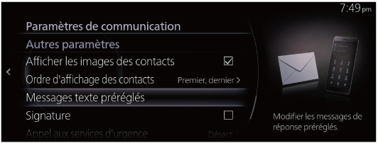 Les messages SMS (Short Message Service) reçus par l'appareil Bluetooth® connecté peuvent être téléchargés, affichés sur l'affichage central et lus à haute voix. De plus, des réponses prédéfinies peuvent être effectuées aussi pour les appels et les messages dans les messages reçus.