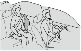 Lorsque les détecteurs de choc des coussins d'air détectent un choc latéral important, le système gonfle le coussin d'air latéral seulement du côté où le véhicule a subi le choc. Le coussin d'air latéral se gonfle rapidement pour réduire les blessures risquant d'affecter la poitrine du conducteur ou du passager avant, causées par l'impact direct sur les composants de l'habitacle tels qu'une portière ou une fenêtre.