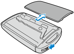 Retirez le couvercle inférieur tout en faisant glisser le bouton dans le sens de la flèche.