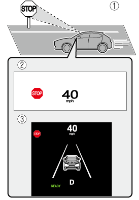 Si la vitesse du véhicule dépasse celle indiquée par le panneau de limitation de vitesse apparaissant sur l'affichage de conduite active/tableau de bord en cours de conduite, le système alerte le conducteur par une notification sur l'affichage de conduite active/tableau de bord et un signal sonore.