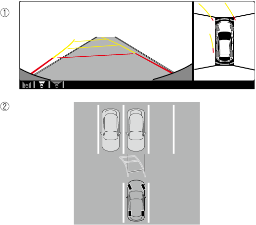 Utilisez la vue de dessus/vue avant pour vous aider à vérifier la sécurité de la zone environnante lors du démarrage, du stationnement ou de l'arrêt du véhicule.