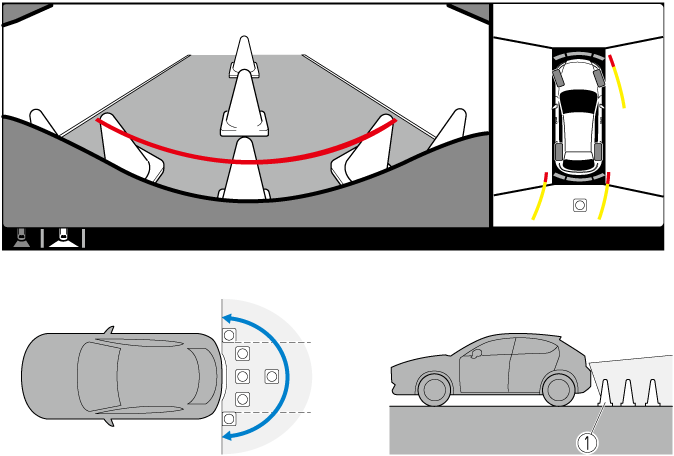 L'écran de vue de dessus/vue arrière grand angle affiche une image de l’arrière du véhicule sous un grand angle et corrige l'image pour aider à détecter les obstructions qui s'approchent par les côtés. Par conséquent, cette vue diffère de la vue réelle.