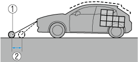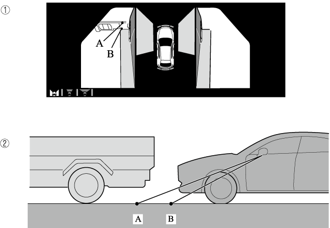 Étant donné que les lignes de guidage d’extrémité avant du véhicule ou les lignes de guidage de distance (caméra arrière) sont affichées sur la base d'une surface plane, la distance à l'objet en trois dimensions affichée sur l'écran est différente de la distance réelle.
