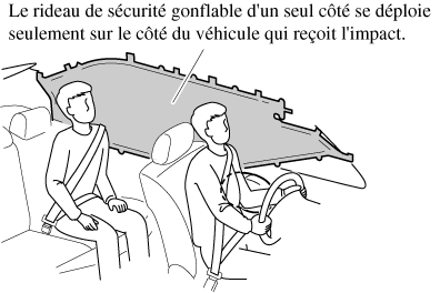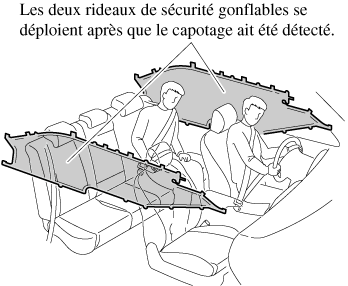 Lorsque les détecteurs de choc du coussin d'air détectent un choc latéral important, le rideau de sécurité gonflable se gonfle rapidement pour réduire les blessures, surtout celles affectant la tête du passager arrière extérieur causées par l'impact direct sur les composants de l'habitacle tels qu'une portière ou une fenêtre.