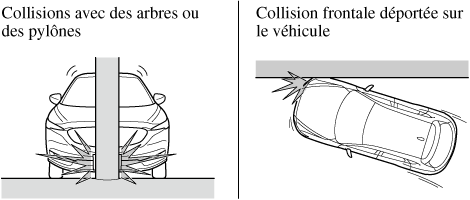 Les illustrations suivantes sont des exemples de collisions frontale/semi-frontale qui sont susceptibles de ne pas être détectées comme assez sévères pour justifier le déploiement de l'équipement de coussin d'air SRS.