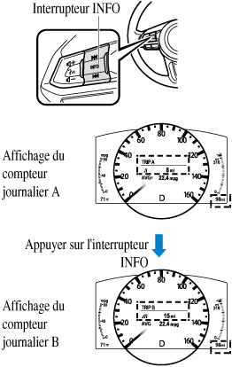 Par exemple, le compteur journalier A peut enregistrer la distance d'un point d'origine, et le compteur journalier B la distance à partir de quand le plein de carburant est fait.
