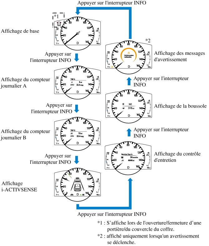 Le contenu de l'écran change chaque fois que la commande d'éclairage du tableau de bord est maintenu enfoncée.