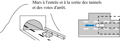 L'indicateur d'avertissement de la BSM peut s'activer et l'écran de détection du véhicule peut être affiché en réponse à des objets stationnaires (garde-corps, les tunnels, les murs latéraux, et les véhicules stationnés) sur la route ou le bas-côté.