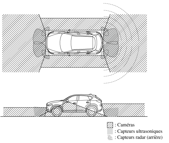 La portée des caméras et la capacité de détection des capteurs sont limitées. Par exemple, les zones en noir à l'avant et à l'arrière de l'image du véhicule et les zones où les images des caméras se rejoignent sont des angles morts pouvant cacher une obstruction. En outre, les lignes de largeur étendues et les lignes de trajectoire anticipée du véhicule doivent uniquement servir de référence, les images à l'écran peuvent différer des conditions réelles.