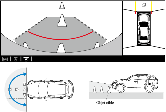 Indique approximativement la largeur du véhicule et la distance (à partir de l'extrémité avant du pare-chocs) devant le véhicule.