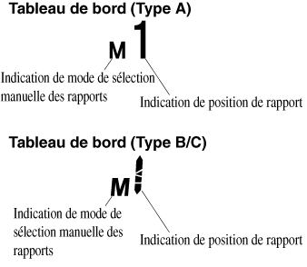 En mode de sélection manuelle des rapports, l'indication de position de plage de boîte de vitesse “M” s'allume sur le tableau de bord.
