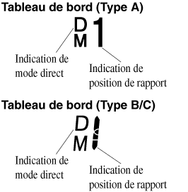 Tandis qu'en mode direct, les indications D et M s'allument et la position de la vitesse utilisée est indiquée.