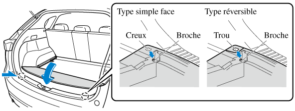 Insérer les creux ou les trous gauche et droit du panneau du compartiment à bagages arrière dans les goupilles.