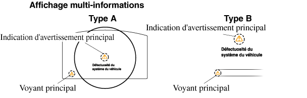 Avec affichage multi-informations (Type A/Type B) S'affiche quand la notification des dysfonctionnements du système est requise. Vérifier le message indiqué sur l'affichage et consulter un concessionnaire agréé Mazda. ![]() L'indication dans l'affichage et le voyant principal dans le tableau de bord sont allumés en même temps. Ceci indique une anomalie du système du véhicule. Vérifier le message indiqué sur l'affichage et consulter un concessionnaire agréé Mazda. Pour plus de détails, reportez-vous aux explications pour les voyants/témoins, dans la section voyants/témoins, qui correspondent au symbole dans la partie supérieure de l'écran. Si un message n'est pas indiqué à l'écran, utiliser l'interrupteur INFO pour afficher l'écran “Avertissement”. Se référer à Message indiqué dans l'affichage multi-informations (Type A) (Rechercher). Se référer à Message indiqué dans l'affichage multi-informations (Type B) (Rechercher). Avec affichage multi-informations (Type C) L'éclairage s'allume en continu dans l'un quelconque des cas suivants. S'adresser à un concessionnaire agréé Mazda.